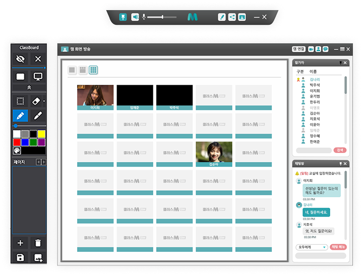 | 칠판 모드 | 빈 화면 및 학습 자료 화면을 배경으로 칠판 기능을 사용할 수 있습니다. |